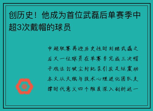 中超联赛再迎历史性时刻!继武磊之后,又一位球员在单赛季完成三次"帽子戏法",打破尘封纪录,引发足坛震动。本文从天赋与技术、心理进化、团队支撑、时代意义四个维度深入剖析这一壮举。通过复盘关键比赛、解...